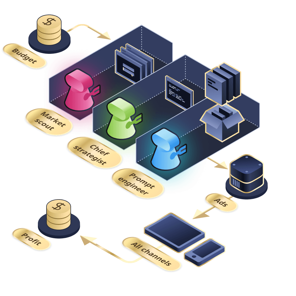 Produces and launches winning creatives across channels, learns from performance, and stores all results to continuously improve execution.
